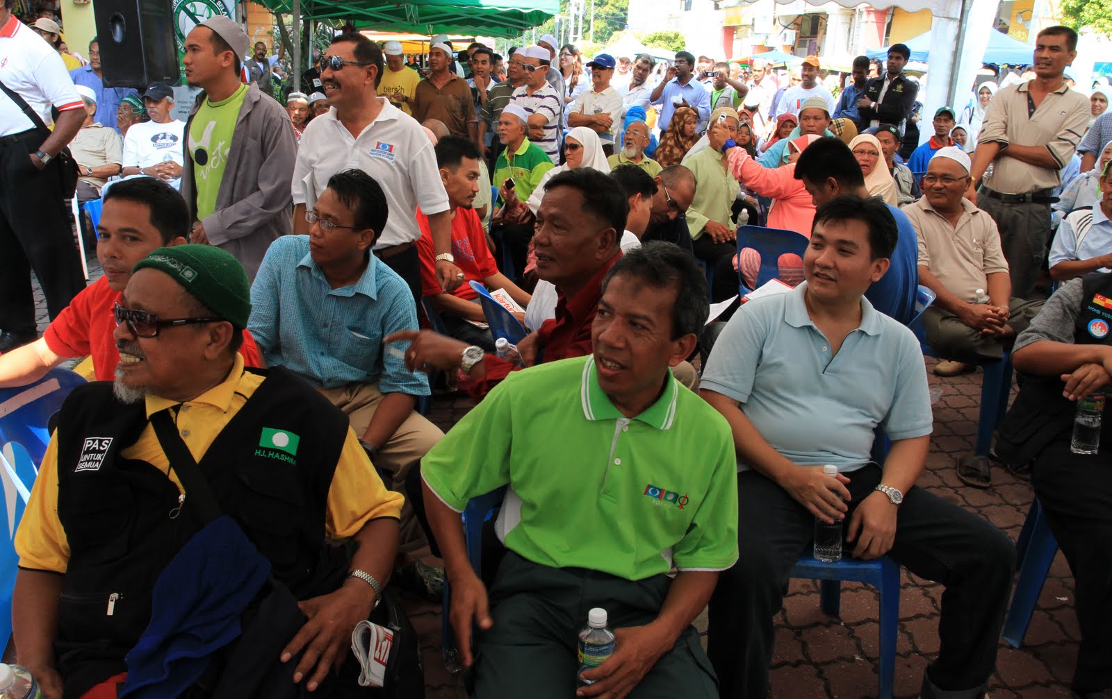 Penyokong santai mengisi masa lapang mendengar ceramah sambil menunggu pencalonan selesai.